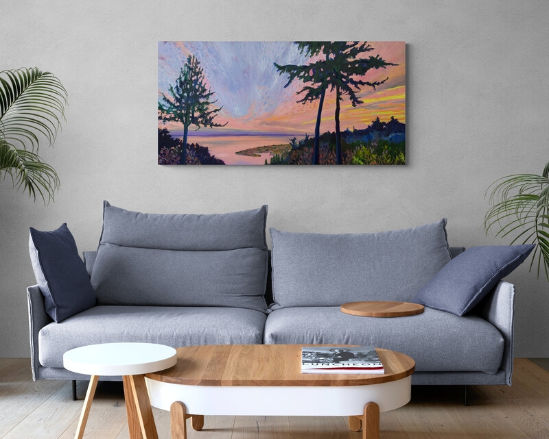View of the Little Qualicum River Estuary, Lasqueti and Texada islands at sunset.